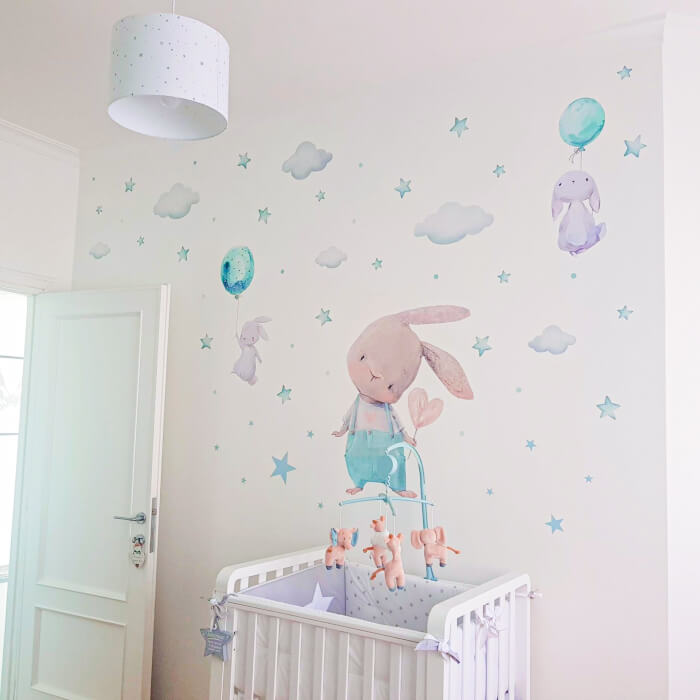 Autocollant au dessus de la crèche – Lapins avec étoiles et ballons