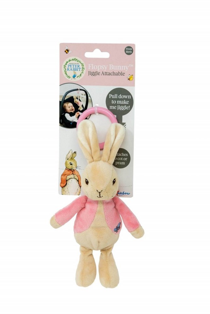 Regardez le lapin Flopsy trembler… Ce jouet est conçu pour divertir l'enfant, il est amusant, doux et attrayant. Il a la taille idéale pour les petites mains qui peuvent le saisir et le tirer vers le bas. Ensuite, regardez les enfants rire aux éclats lorsque le lapin Flopsy remonte en tremblant. Le jouet est livré avec un anneau de fixation, ce qui en fait un compagnon de voyage idéal. Le jouet peut être facilement fixé à une poussette, un siège auto ou un lit. Principales caractéristiques : jouet doux et attrayantconvient dès la naissancefixable à la poussette, au lit ou au siège auto