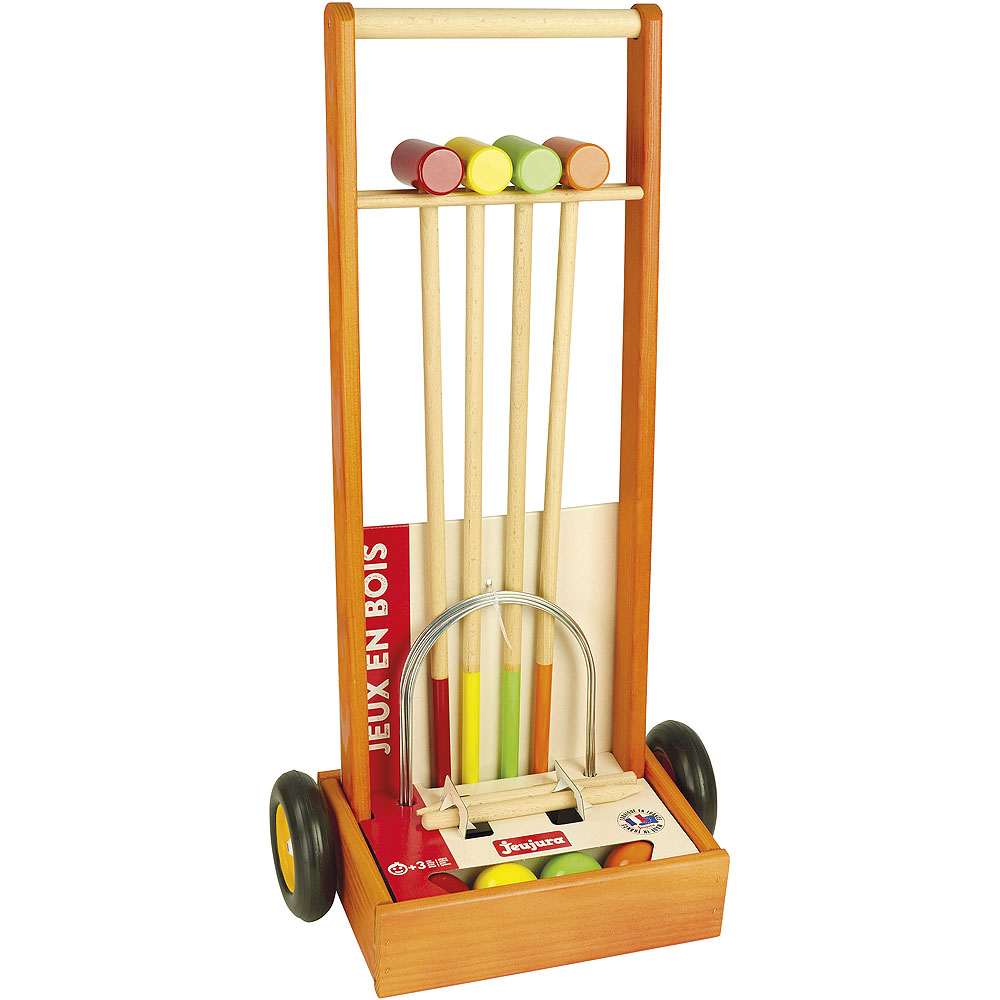 Le croquet vous permet de passer des moments actifs en famille ou entre amis. Avec le chariot de transport, votre enfant se transforme en un caddie enthousiaste. Fabriqué en France, à partir de bois de hêtre et de pin massif d'origine française. Les éléments sont traités exclusivement avec des peintures et des vernis à base d'eau. Caractéristiques principales:pour 2 à 4 joueurs4 maillets, 4 balles, 6 arceaux et 2 piquetspièces en bois massifchariot de transportfabriqué en France