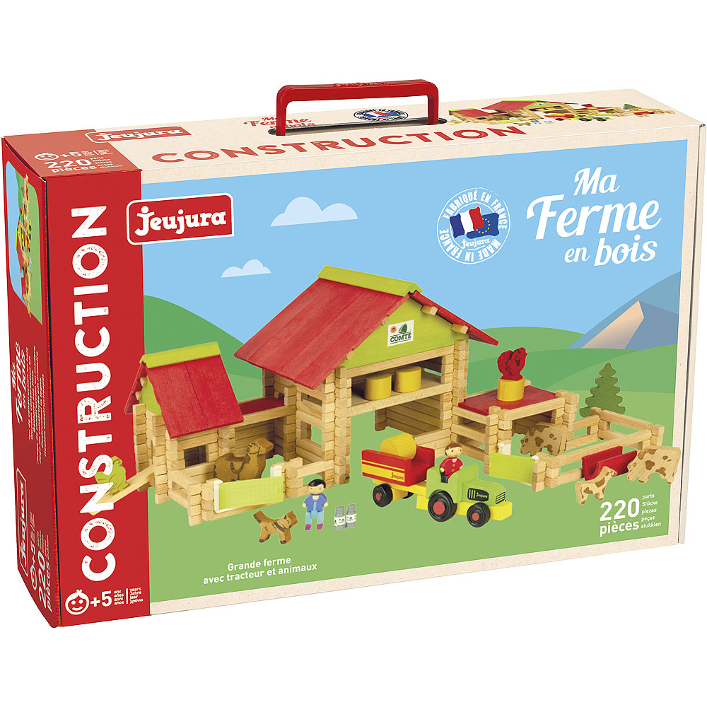 Ce jeu de construction en bois, qui familiarise les jeunes constructeurs avec la vie à la ferme, deviendra un élément décoratif de la chambre d'enfant. Les constructions Jeujura Constructions ont une longue tradition et font partie des jouets français classiques. Elle propose des séries thématiques dédiées aux chalets, aux maisons et aux fermes, mais aussi au Far West et au Moyen Âge. Ils peuvent être librement combinés et de nombreux accessoires, figurines et véhicules sont également disponibles. Ils sont fabriqués en France, à partir de bois de hêtre et de pin massif d'origine française. Les pièces sont traitées exclusivement avec des peintures et des vernis à base d'eau. Chaque ensemble est emballé dans une valise en carton pratique imprimée avec des encres végétales et un manuel facile à comprendre est inclus. Principales caractéristiques : 220 pièces en bois massif et un tapisemballage pratiquefabriqué en France