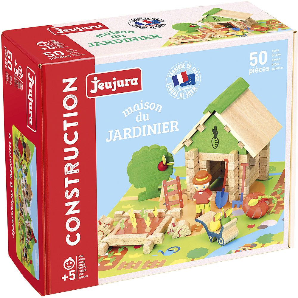 La construction en bois du jardin développe l'imagination et devient un ornement de la chambre d'enfant. Les constructions Jeujura Constructions ont une longue tradition et font partie des jouets français classiques. Elle propose des séries thématiques dédiées aux chalets, aux maisons et aux fermes, mais aussi au Far West et au Moyen Âge. Ils peuvent être librement combinés et de nombreux accessoires, figurines et véhicules sont également disponibles. Ils sont fabriqués en France, à partir de bois de hêtre et de pin massif d'origine française. Les pièces sont traitées exclusivement avec des peintures et des vernis à base d'eau. Chaque ensemble est emballé dans une valise en carton pratique imprimée avec des encres végétales et un manuel facile à comprendre est inclus. Principales caractéristiques : 50 pièces en bois massif et un tapisemballage pratiquefabriqué en France