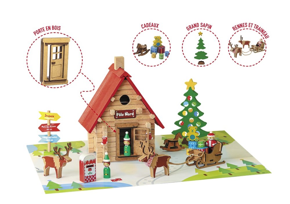 Découvrez la magie de Noël ! Pénétrez dans la maison du Père Noël et admirez la beauté du pôle Nord ! Avec la maisonnette et le Père Noël dans le set, vous trouverez également de petits lutins, un traîneau avec des rennes, une boîte aux lettres, un panneau et un sapin de Noël avec des cadeaux. Les constructions Jeujura Constructions ont une longue tradition et font partie des jouets français classiques. Elle propose des séries thématiques dédiées aux chalets, aux maisons et aux fermes, mais aussi au Far West et au Moyen Âge. Ils peuvent être librement combinés et de nombreux accessoires, figurines et véhicules sont également disponibles. Ils sont fabriqués en France, à partir de bois de hêtre et de pin massif d'origine française. Les pièces sont traitées exclusivement avec des peintures et des vernis à base d'eau. Chaque ensemble est emballé dans une valise en carton pratique imprimée avec des encres végétales et un manuel facile à comprendre est inclus. Principales caractéristiques : 90 pièces en bois massif et un tapisemballage pratiquefabriqué en France