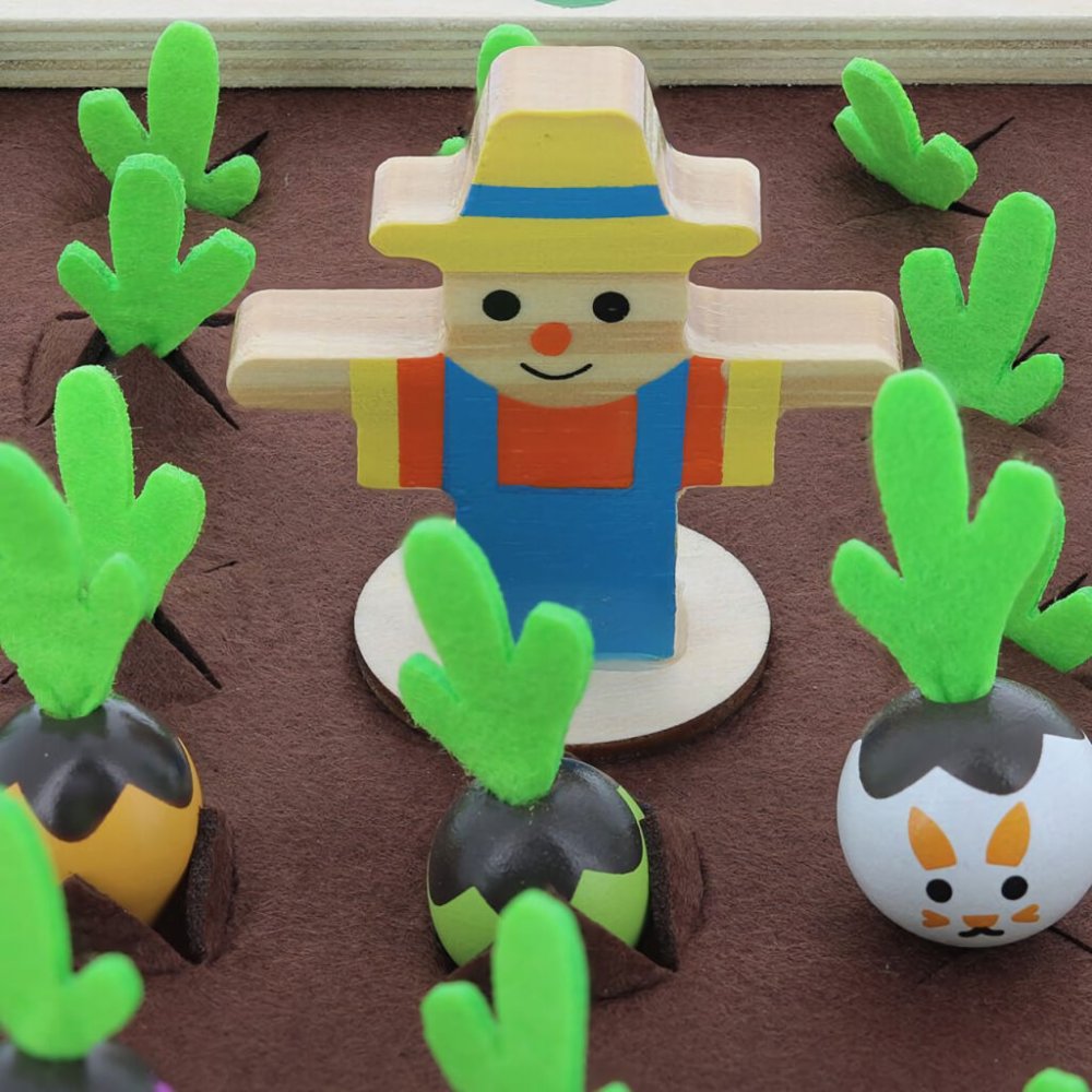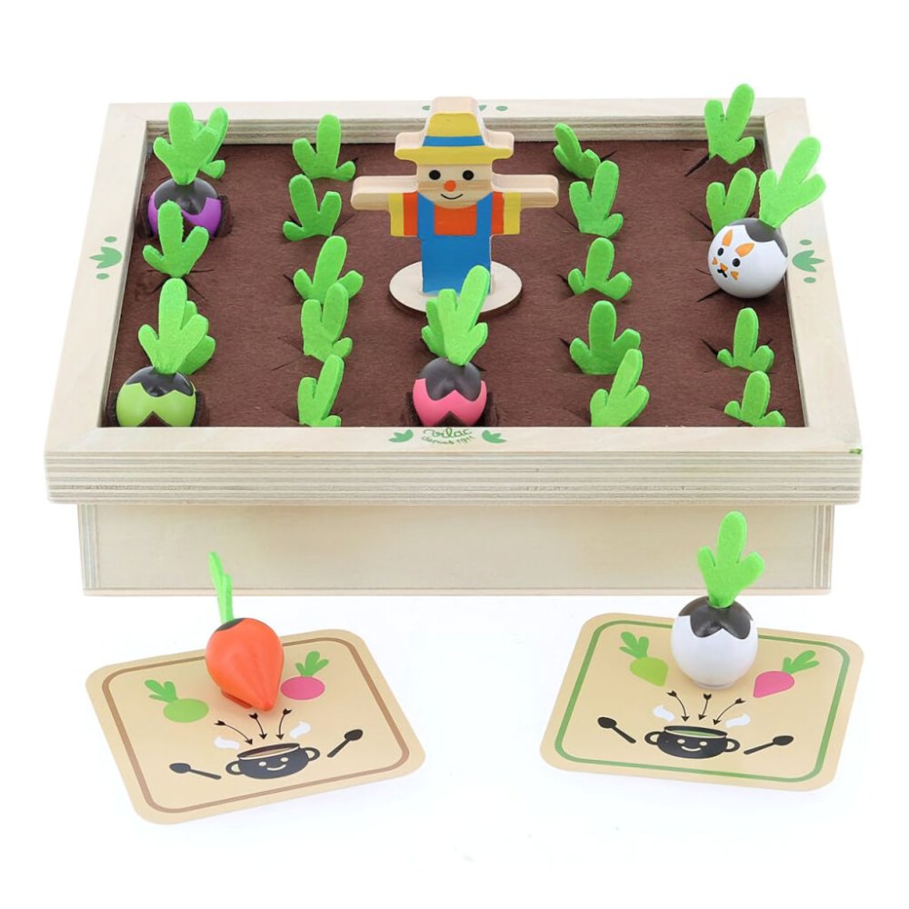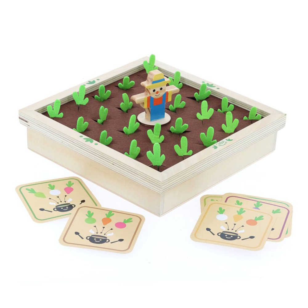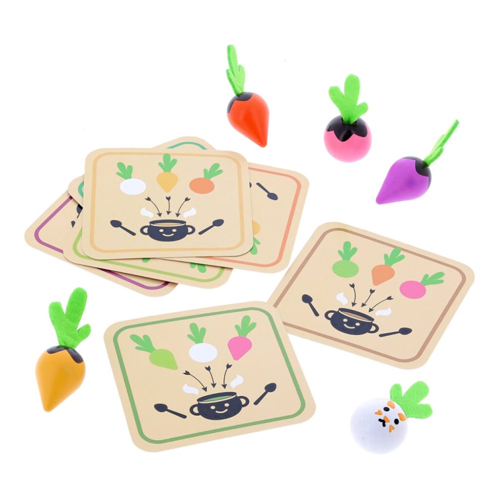 Préparez une soupe de légumes pleine de couleurs vives. Mais faites attention au lapin blanc, il vous volera vos ingrédients ! Vous pouvez jouer au jeu comme un simple jeu de memory même avec de jeunes enfants, les cartes de recettes ajoutent une touche d'originalité, ce qui donne une autre dimension au plaisir. Qui parviendra le premier à compléter la recette et à préparer la soupe ? Essayerez-vous de compléter plusieurs recettes ou de pimenter le jeu en attribuant des points aux différents types de légumes ? Les éléments du jeu combinent du contreplaqué épais, du bois massif ou du feutre et sont décorés de manière attrayante et thématique. Le jeu propose 2 variantes, Pexeso et Cuisinons de la soupe. Principales caractéristiques : pour 2–6 joueursplateau de jeu, 24 pièces de jeu et 7 cartes de recettes2 variantes de jeu, adaptées aux jeunes enfantstraitement unique et attrayant Documentation : Manuel du jeu Récolte du jardin (CZ)Manuel du jeu Récolte du jardin (SK)