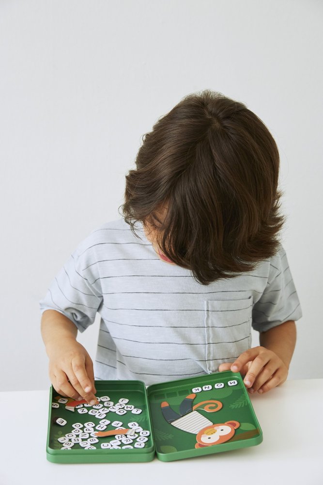 Devinez le mot secret de votre coéquipier avant qu'il ne termine le dessin du singe ! Avec ce jeu de voyage magnétique, les enfants développeront leur vocabulaire : c'est essentiellement un jeu du pendu amélioré…  Principales caractéristiques :  Superbe jouet de voyage dans une boîte en métal Imprimé avec des encres non toxiques qui tiennent compte de la santé des enfants et de la planète