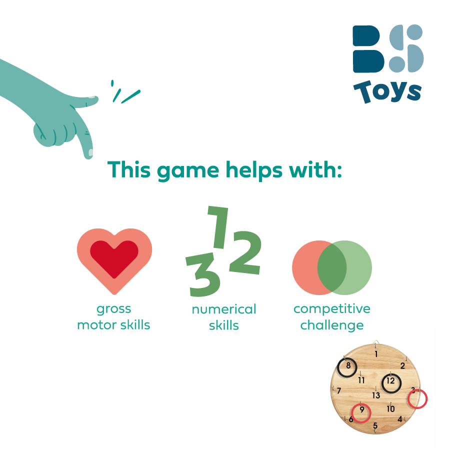 Un jeu d'adresse simple pour les enfants de 6 ans et plus. Les enfants lancent les anneaux sur les agrafes fixées à la cible en bois. Ensuite, ils additionnent les points. Le jeu peut être joué par chaque individu ou des équipes peuvent être formées. La mission de ce jeu est de permettre aux enfants de s'amuser sans les smartphones et les tablettes.