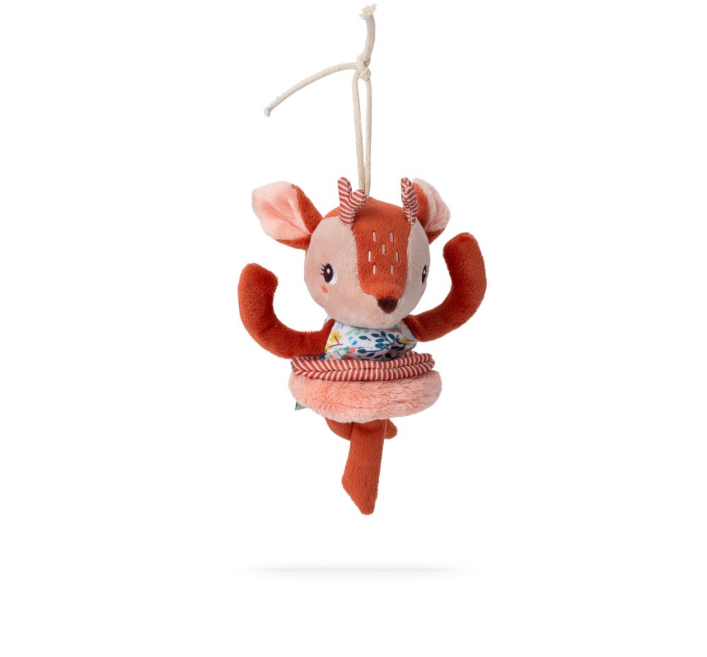 Jouet vibrant en tissu amusant pour les enfants à partir de 6 mois. Lorsque les enfants tirent sur les petites jambes, la biche Stella se met soudain à danser joyeusement. Un grand divertissement et une sensation surprenante pour les petites mains ! Le jouet peut être accroché aux sièges auto, aux poussettes ou au berceau. Le cerf dansant attire l'attention des enfants par le mouvement et le son, et développe ainsi leurs sens. Le jouet est fabriqué en 100% polyester. Les dimensions du jouet sont de 14 x 14 x 11 cm. Ne pas laver, essuyer uniquement avec un chiffon humide.