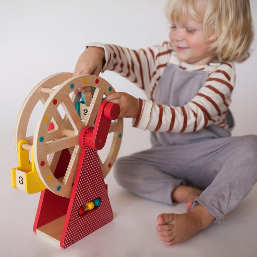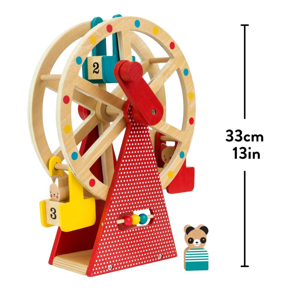 Emmenez vos trois amis animaux faire un tour sur cette magnifique et élégante grande roue en bois. Tournez la manivelle et regardez la grande roue tourner ! Utilisez le compteur inclus pour compter les tours, par exemple. Avec la grande roue en bois rotative, trois chariots et trois amis animaux en bois de hêtre, vous vous amuserez beaucoup.  Principales caractéristiques :  La grande roue en bois prémontée et de qualité tourne à l'aide d'une manivelle Comprend trois amis animaux en bois de hêtre La construction robuste en bois de la roue est peinte avec des peintures non toxiques à base d'eau Jouet élégant et bel élément de décoration dans chaque chambre d'enfant Conforme à toutes les normes de sécurité