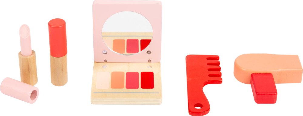 Le salon de beauté est ouvert ! Les jeunes beautés peuvent se faire une beauté selon leurs envies et ensuite vérifier leur apparence dans le miroir inclinable. Cet ensemble est complété par des accessoires en bois pour le maquillage et les soins capillaires – deux rouges à lèvres, un petit fard à paupières avec miroir, un peigne et un sèche-cheveux. Les outils peuvent être rangés dans le tiroir, qui est divisé en trois parties pratiques. Grâce à sa taille compacte, cette coiffeuse peut s'intégrer dans n'importe quelle chambre d'enfant ou jardin d'enfants. Principales caractéristiques : contient 9 piècesdesign rétroconstruction en bois stable