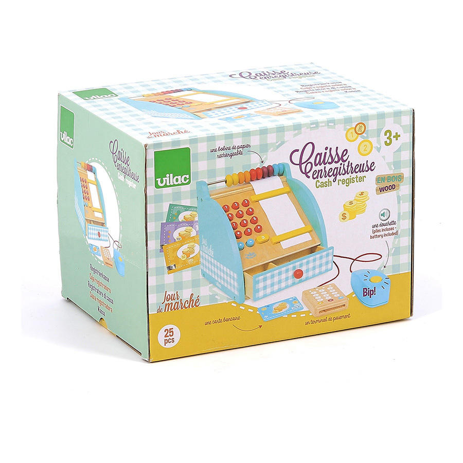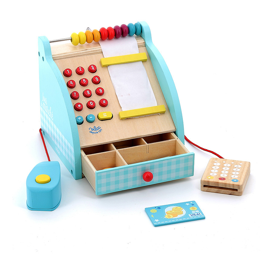 Caisse enregistreuse en bois avec tiroir-caisse, boulier et terminal bancaire. Comprend également un bouton sonore classique et un clavier numérique fonctionnel. Les accessoires comprennent des billets et des pièces. Principales caractéristiques : développe les compétences en communication et l'interaction socialeéléments fonctionnels de la caisse enregistreuse tels que les boutons et le tiroir-caisseaccessoires inclus
