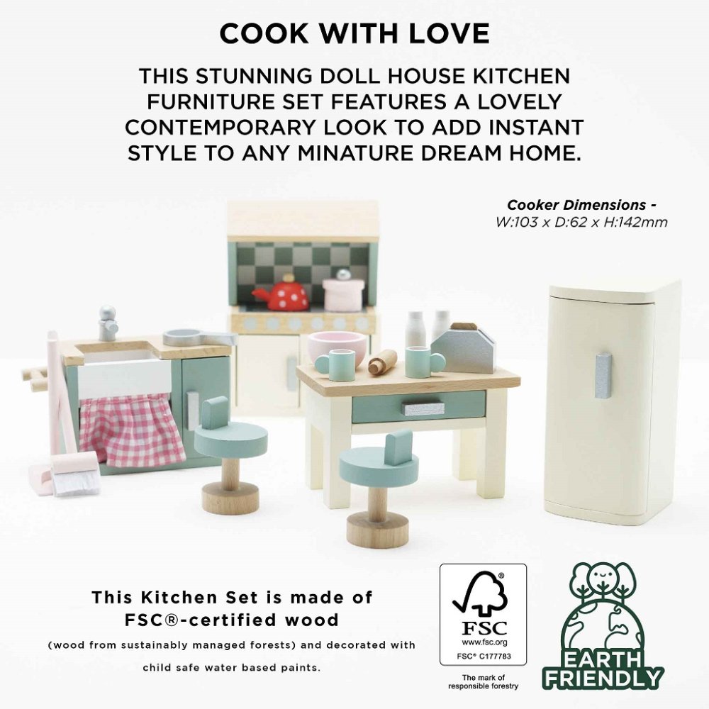 Aucune maison de poupée n'est complète sans une cuisine équipée. Avec ce magnifique ensemble de cuisine en bois, les enfants peuvent cuisiner ou faire cuire quelque chose de bon pour leurs invités miniatures. Cet ensemble imaginatif avec une attention particulière aux détails se compose d'un évier, d'une cuisinière, d'un four avec porte ouvrante, d'un grand réfrigérateur avec porte ouvrante, d'une table avec 2 chaises sur laquelle vous pouvez couper et préparer. Il convient aux maisons de poupées de Le Toy Van. Vous trouverez d'autres accessoires pour maisons de poupées de la gamme Daisylane sur notre site web. Des jouets avec un butTous les jouets Le Toy Van sont fabriqués dans un but précis : durer longtemps. Conçus avec amour par des artisans expérimentés, selon des pratiques éthiques et avec des matériaux durables, plus respectueux de notre planète. Principales caractéristiques : échelle 1:12fabriqué de manière éthique à partir de matériaux durablestesté selon les normes les plus strictespeint avec des peintures non toxiques à base d'eauentraîne les compétences de communication et la coordinationInspire un jeu créatif et imaginatif  Collection Daisylane: Collection prestigieuse de maisons de poupées et d'accessoires de Le Toy Van. Il y a plus de 25 ans, le fondateur Georges a conçu sa toute première maison de poupées, la pierre angulaire de cette entreprise. Fabriquées de manière éthique à partir de matériaux durables, les maisons de poupées en bois Daisylane sont uniques et ne freineront pas l'imagination des enfants. Héritage familial, un véritable investissement dans le jeu.    La marque et le certificat FSC® (Forest Stewardship Council) garantissent que le bois utilisé pour fabriquer le produit n'a pas été récolté illégalement et provient de forêts gérées de manière durable ou naturelle, dans le respect d'exigences environnementales et sociales strictes. La marque FSC® sur le produit signifie qu'en l'achetant, vous contribuez à protéger les forêts et à soutenir une gestion durable, responsable ou proche de la nature, grâce à laquelle nos forêts sont plus stables, plus saines, ont une composition d'espèces naturelle et résistent mieux aux conséquences négatives du changement climatique.