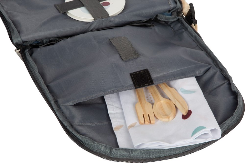 Transformez chaque pique-nique en une expérience inoubliable avec le sac à dos de pique-nique ! Ce sac à dos pratique contient tout ce dont vous avez besoin pour un repas confortable en plein air : une assiette en bois, une tasse et des couverts pour deux personnes. Vous y trouverez également un thermos, un couteau pliant et une couverture de pique-nique. La poche intérieure spacieuse avec fermeture éclair permet de ranger en toute sécurité tous les accessoires grâce à des sangles élastiques et une fermeture velcro. Les bretelles réglables offrent un confort optimal lors du transport et permettent d'adapter correctement le sac à dos à l'enfant. L'aspect moderne, combinant le blanc neutre, le bois naturel et les couleurs tendance populaires, s'intègre harmonieusement dans chaque chambre d'enfant et s'accorde parfaitement avec les autres produits de la gamme „Tasty“. Ce sac à dos est le compagnon idéal pour des moments de pique-nique inoubliables, des jeux créatifs et des excursions dans la nature ! L'emballage contient : 1 sac à dos, 1 thermos, 1 couverture de pique-nique, 2 cuillères, 2 couteaux, 2 fourchettes, 2 tasses, 2 assiettes, 1 couteau de poche. Principales caractéristiques : sac à dos de pique-nique moderne avec de nombreux accessoires pour deux personnesfavorise le développement de la motricité fine, des compétences sociales et des compétences quotidiennesfermeture éclair enveloppante et poche intérieure séparée pour un rangement facileles bandes élastiques flexibles maintiennent les accessoires en toute sécuritébretelles réglables pour un confort de port élevédesign moderne combinant le blanc, le bois naturel et des couleurs tendanceemballé dans une boîteCompatible avec les autres produits de la gamme « Tasty »