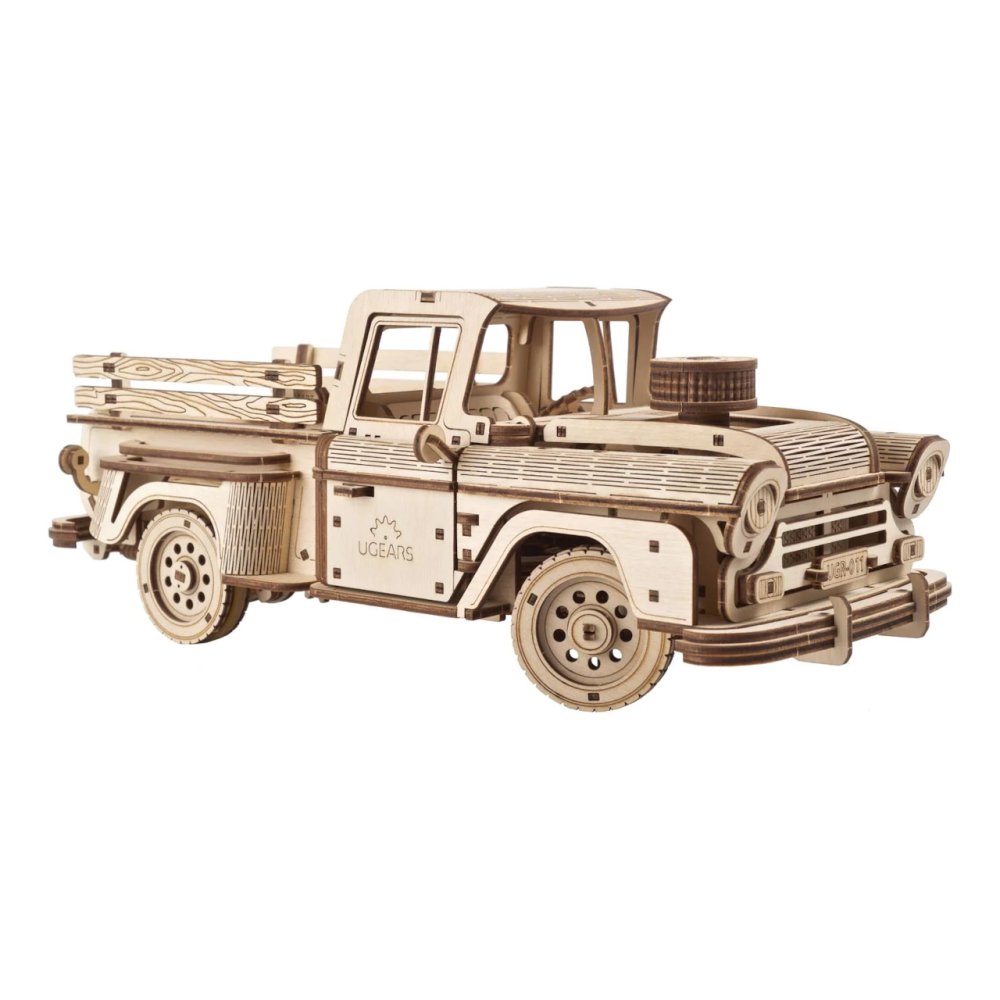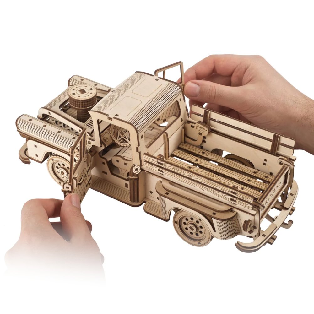 Aucune charge n'est trop lourde ! Un kit de camion fabriqué en contreplaqué. Remontez le temps, à l'époque où vous n'aviez pas besoin d'un diplôme en informatique pour réparer le moteur de votre voiture ! Si vous n'avez peur d'aucun travail comme ce bourreau de travail infatigable, sa construction sera un jeu d'enfant pour vous. Chaque fan de voitures anciennes sera ravi de ses formes, qui ont été inspirées par le pick-up américain classique Chevrolet 3100 de 1959. Son entraînement est assuré par un puissant moteur à ressort qui est l'un des meilleurs de la gamme de modèles UGEARS, de sorte que le camion peut parcourir jusqu'à six mètres avec une seule traction et peut transporter près d'un demi-kilogramme de marchandises sur sa carrosserie ! Il est équipé non seulement d'une transmission permettant la marche arrière et le point mort, mais aussi d'un différentiel, grâce auquel il offre une maniabilité exceptionnelle ! La direction peut être facilement contrôlée et sécurisée, de sorte que la voiture peut se déplacer de manière totalement indépendante le long de l'itinéraire choisi. Avec une satisfaction parfaite, vous pouvez ensuite observer le travail des essieux suspendus lorsque vous conduisez avec une charge et sur le terrain. Les décorations fonctionnelles du modèle comprennent également d'autres détails mécaniques. Vous pouvez ouvrir les portes de l'extérieur et de l'intérieur, et le capot cache un moteur qui vibre de manière réaliste pendant le fonctionnement. Montrez vos muscles et organisez des courses avec d'autres modèles UGEARS ! Équipé d'instructions de montage détaillées. Caractéristiques principales:460 pièces découpées avec précisiondifficulté d'assemblage élevéeportes et capot ouvrantsle modèle final est dirigeable et capable de rouler de manière autonome, marche arrière compriseConçu et fabriqué en Ukraine