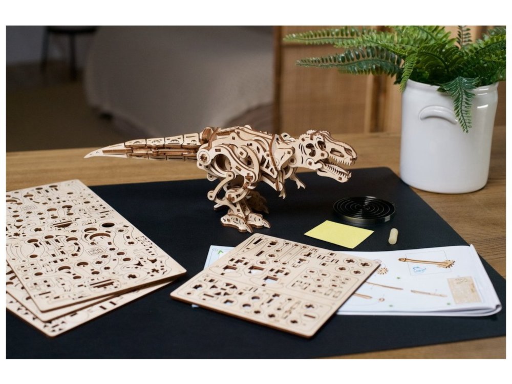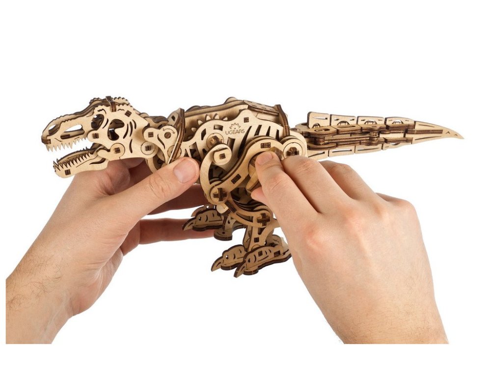 Assemblez et donnez vie au prédateur antique terrifiant qui a foulé la Terre. Le Tyrannosaurus Rex est un modèle mécanique en bois DIY de tyrannosaure marcheur. Il est alimenté par un ressort métallique qui transmet la force à travers un engrenage réduit, faisant tourner un axe qui entraîne les jambes. Un système de liaison intelligent permet à ce roi des dinosaures de marcher sur ses propres pieds. Une roue dentée excentrique met la queue en mouvement synchrone avec les jambes, ce qui aide le dinosaure à garder l'équilibre et à ne pas tomber sur le côté, comme dans la nature. Cet incroyable modèle de dinosaure marcheur est un modèle réduit en bois DIY à remontoir d'un Tyrannosaurus Rex adulte. Une clé de remontage est cachée dans la partie supérieure de la queue. Retirez la clé et insérez-la dans le mécanisme à cliquet sur le côté gauche du dinosaure et assurez-vous que la tête du fémur gauche est hors de l'ouverture (si nécessaire, mettez l'interrupteur en position "on" et faites tourner l'appareil au-dessus des épaules du T-Rex pour le mouvement de la jambe). Mettez l'interrupteur en position « arrêt » (vers la tête) et remontez le mécanisme d'une demi-douzaine de tours dans le sens des aiguilles d'une montre, en remettant la clé dans sa position entre la queue et le corps. Placez le Tyrannosaure sur une surface lisse et plane, tenez l'automate par le corps (ne serrez pas les jambes !), mettez l'interrupteur en marche et relâchez. Votre Tyrannosaure se déplacera et cherchera de la nourriture, sa queue se balancera et ses mâchoires claqueront de haut en bas dans l'attente. C'est en fait un peu effrayant ! Tout fan qui apprécie le design et la mécanique exceptionnels voudra ajouter le T-Rex à sa collection. Principales caractéristiques : 249 pièces coupées avec précisiondifficulté d'assemblage élevéeConçu et fabriqué en Ukraine