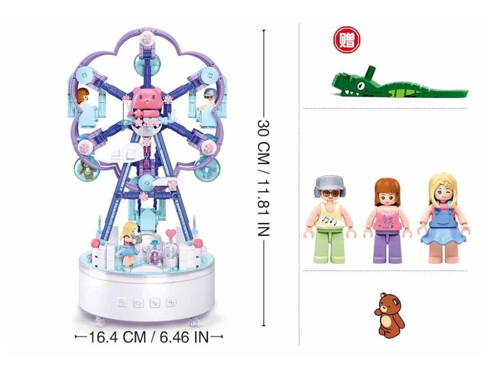 Replongez dans votre enfance et rappelez-vous tout le plaisir que vous avez eu à la fête foraine ! Construisez votre propre manège, allumez les lumières, écoutez l'une des 13 chansons et regardez la partie supérieure du socle du carrousel tourner au rythme d'une musique familière. Vous pouvez choisir parmi plusieurs berceuses ou chansons apaisantes. Il y a aussi une chanson d'anniversaire et une chanson du Nouvel An. Grâce aux engrenages et à la chaîne, le manège peut également tourner verticalement. L'alimentation se fait par 3 piles AA ou un câble USB 5V. Les jeux de construction innovants Sluban peuvent être combinés avec des jeux de construction similaires de nombreux autres fabricants importants. Ils sont fabriqués à partir de plastique ABS de haute qualité, sûr et durable. Chaque construction est fournie avec un manuel d'assemblage et est emballée dans une boîte en carton colorée. Principales caractéristiques : 620 pièces, 3 figurinesavec son et lumière13 mélodiesle son, l'éclairage et la rotation peuvent être activés et désactivésle manège est également rotatif verticalementCâble USB 5V ou 3 piles AA (piles non incluses)figurines innovantes avec des parties du corps rotatives et pivotantescompatible avec les jeux de construction d'autres fabricants