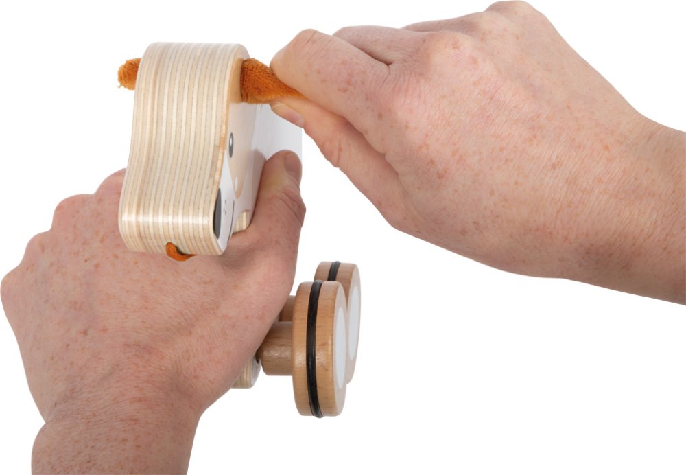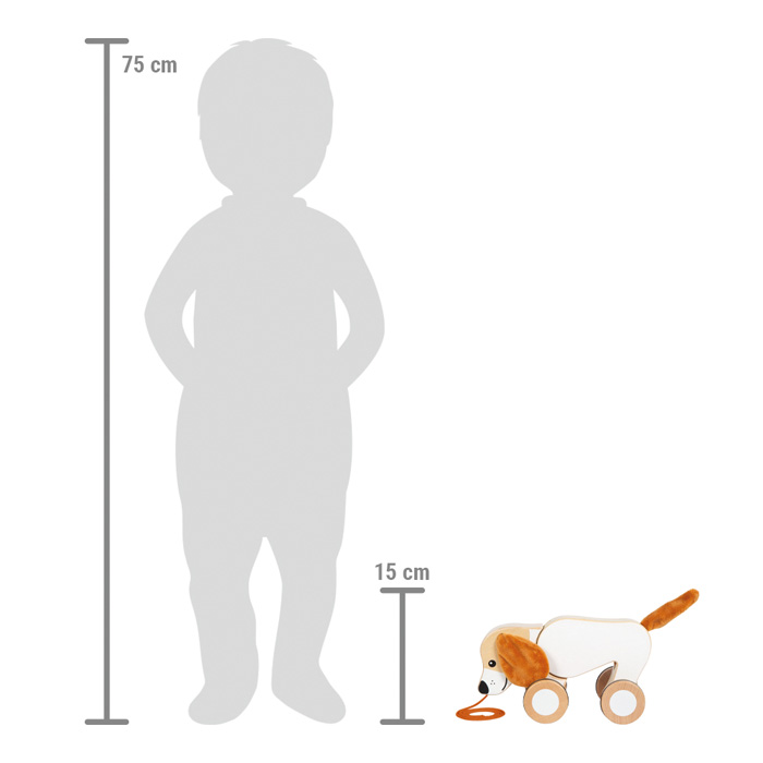 Ouaf, ouaf ! Le meilleur ami de l'homme, un adorable petit chien aux oreilles douces et à la queue en bois massif de haute qualité, deviendra certainement un compagnon inoubliable pour chaque enfant lors de ses premiers pas. Il peut être facilement tiré avec une ficelle et encourage les jeunes enfants à ramper et à marcher. Ils s'amuseront ainsi beaucoup lors de leurs promenades. La partie avant du corps du chien et la tête sont mobiles, il peut donc se cabrer et, lorsque la ficelle est relâchée, il semble que le chien renifle le sol. Les roues caoutchoutées favorisent une conduite souple et silencieuse. Le jouet favorise le développement de la motricité, de la mobilité et de la perception sensorielle. Les oreilles et la queue peuvent être facilement retirées et lavées. Principales caractéristiques : conception robustecorps et tête mobilesoreilles et queue douces amoviblesavec une corde de 60 cm de longfavorise l'équilibre et la coordination des mouvementsdéveloppe la motricitéavec des roues caoutchoutées silencieusesinspire la créativité et l'imagination des enfants