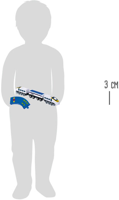 Locomotive moderne en plastique et wagon en bois avec télécommande, elle dispose de 8 fonctions au total. Vous pouvez contrôler la locomotive dans deux directions, elle émet des sons lorsque vous appuyez sur le bouton(annonce du haut-parleur, signal de la barrière, sifflet du conducteur, bruits de conduite, passage sur le pont), vous pouvez même allumer les lumières. Excellent complément au circuit de train en bois populaire. Le train est compatible avec toutes les marques courantes de circuits de train telles que Bigjigs, Maxim, Brio, Woody, Bino, Tomáš, Tesco, Ikea et autres. Les piles de la locomotive 3xAAA et les piles de la télécommande 2xAA ne sont pas incluses. Principales caractéristiques : compatible avec toutes les marques courantes de circuits de trainjouet avec son et lumière8 fonctions
