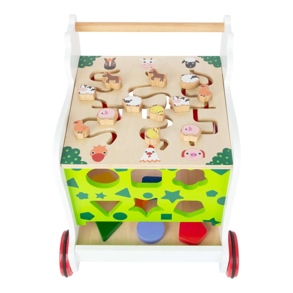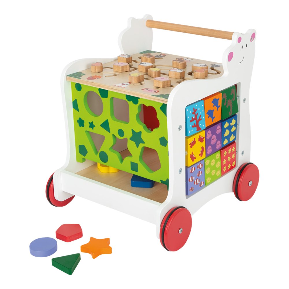 Toujours avec un ours en peluche à vos côtés ! Le trotteur multifonctionnel offre aux enfants un soutien pour explorer le monde et pratiquer diverses compétences. Avec son aide, il est possible de développer la motricité globale et fine, la reconnaissance des couleurs, des formes et, grâce au tableau, également le dessin et l'écriture. Avec un motif d'ours en peluche, il deviendra ludiquement un compagnon utile lors des voyages dans la chambre d'enfant. Il offre un espace de rangement pratique, est stable et les roues caoutchoutées assurent un fonctionnement silencieux et cultivé sur tous les types de surfaces. Le trotteur est fabriqué à partir d'une combinaison de contreplaqué solide et durable et de bois massif. Le produit nécessite un assemblage, livré avec un manuel d'instructions illustré pour l'assemblage. Principales caractéristiques : trotteur multifonctionnel et 6 pièces d'encastrementencastrement, labyrinthe, cubes rotatifs et tableau pour dessiner à la craieespace de rangement pratiquefonctionnement silencieuxconstruction en bois durable