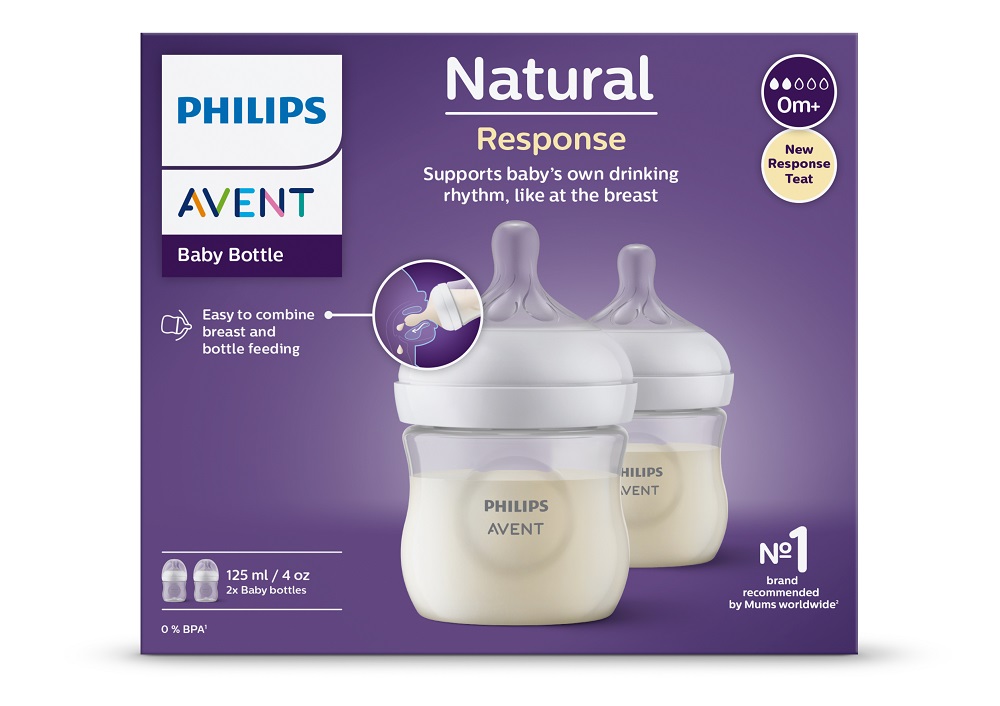 Le biberon Natural Response suit le rythme du boire de l'enfant, comme le rythme du sein. – 125 ml, 0 m+, 2 unités – La nouvelle tétine des biberons Natural Response permet au bébé de téter, d'avaler et de respirer comme s'il buvait au sein. – Combinaison facile de l'allaitement maternel et de l'alimentation au biberon – Valve anti-colique – Conception en forme de poitrine sans goutte d'eau.Favorise le rythme naturel de consommation d'eau de bébéLa tétine de la sucette Natural Response ne libère du lait que lorsque le bébé boit activement. Le bébé peut boire, avaler et respirer à un rythme naturel, comme au sein. Il est donc facile de combiner l'allaitement au sein et au biberon. Combinaison facile de l'allaitement maternel et de l'alimentation au biberonPrise du sein naturelle grâce à la tétine en forme de sein. La tétine libère le lait lorsque le bébé boit activement.Autres avantages :- Choisissez la tétine à débit adapté à votre bébé- La conception de la tétine évite les gouttes, les débordements et les pertes de lait- Compatible avec la gamme Philips Avent- Facile à saisir même pour les petites mains- Facile à utiliser, facile à nettoyer et rapide à assembler- Les sucettes et les biberons Natural Response sont sans BPA- Soyez patient et laissez l'enfant s'habituer à- L'air ne pénètre pas dans le ventre du bébé- Conçu pour réduire le risque de coliques et de maux de ventreTétine Réponse NaturelleLa tétine Natural Response fonctionne en harmonie avec le rythme naturel d'alimentation du bébé, ce qui permet de combiner facilement l'allaitement au sein et au biberon. Il est doté d'une ouverture unique qui ne libère le lait que lorsque le bébé boit activement. Ainsi, lorsque le bébé s'arrête de boire pour avaler et respirer, le flux de lait est également interrompu.Aspiration naturelleLa sucette large, douce et flexible est conçue pour imiter la forme et la surface du sein afin d'aider bébé à prendre le sein et à se nourrir confortablement.Valve anti-coliqueLa valve anti-colique est conçue pour empêcher l'air de pénétrer dans le ventre du bébé pendant la tétée, afin de réduire le risque de coliques et de douleurs.La conception de la tétine empêche les gouttesL'ouverture de la tétine est conçue pour libérer le lait uniquement lorsque le bébé se nourrit. Vous pouvez être sûr qu'aucun lait ne se répandra, que ce soit à la maison ou en déplacement.Facile à utiliser et à nettoyerLe large col de la bouteille facilite le remplissage et le lavage. La bouteille ne comporte que quelques pièces, elle est donc facile et rapide à assembler.Facile à saisirCe biberon ergonomique est facile à tenir dans n'importe quel angle et assure un confort maximal pendant la tétée. Il sera facile à tenir pour vous et les petites mains de votre bébé.Compatible avec toute la gammeCombinez des éléments de nos tire-laits, biberons et tasses pour créer un produit adapté à vos besoins.sans BPALes biberons Philips Avent Natural sont fabriqués sans BPA.Trouver le bon débit de trayonsChaque bébé se nourrit différemment et se développe à son propre rythme. Nous avons conçu plusieurs débits pour que vous puissiez trouver celui qui convient à votre bébé et personnaliser le biberon. Toutes les tétines Natural Response sont en silicone souple.AVIS!- La succion constante et prolongée de liquides provoque des caries.- Vérifiez toujours la température des aliments avant de les donner.- Mettez le produit au rebut dès les premiers signes d'endommagement ou d'usure.- Conservez les parties non utilisées du produit hors de portée des enfants.- Ne jamais connecter avec des cordes, des rubans, des lacets ou des pièces détachéesl'enfant peut être étranglé si le vêtement est trop épais.- N'utilisez jamais une tétine d'allaitement comme une tétine normale.- Ce produit doit toujours être utilisé sous la surveillance d'un adulte.Il n'est pas recommandé d'utiliser un micro-ondes pour chauffer des aliments ou des boissons pour les enfantsle four. Les fours à micro-ondes peuvent détruire les nutriments précieux contenus dans les aliments/boissons et peuventpour créer des températures élevées à certains endroits. Si vous choisissez de chaufferdans le four à micro-ondes, remuez très soigneusement les aliments/boissons réchaufféset assurent une répartition uniforme de la chaleur. Vérifiez également avant de servirtempérature. Placez toujours le récipient dans le four à micro-ondes sans le verrouillerla valve AirFree, la tétine et le bonnet. Ne laissez pas les enfants joueravec de petites pièces ou de marcher ou courir pendant l'utilisation du flacon. Du lait quiaprès l'alimentation, toujours renverser. Vérifier le produit avant chaque utilisation etétirer la tétine dans toutes les directions. Dès les premiers signes d'endommagement ou dejeter le produit.Adresse du fournisseur : Philips Consumer Lifestyle B.V., Tussendiepen 4, 9206 AD Drachten, Pays-Bas, PH.CentralRegulatoryOfficer@philips.com