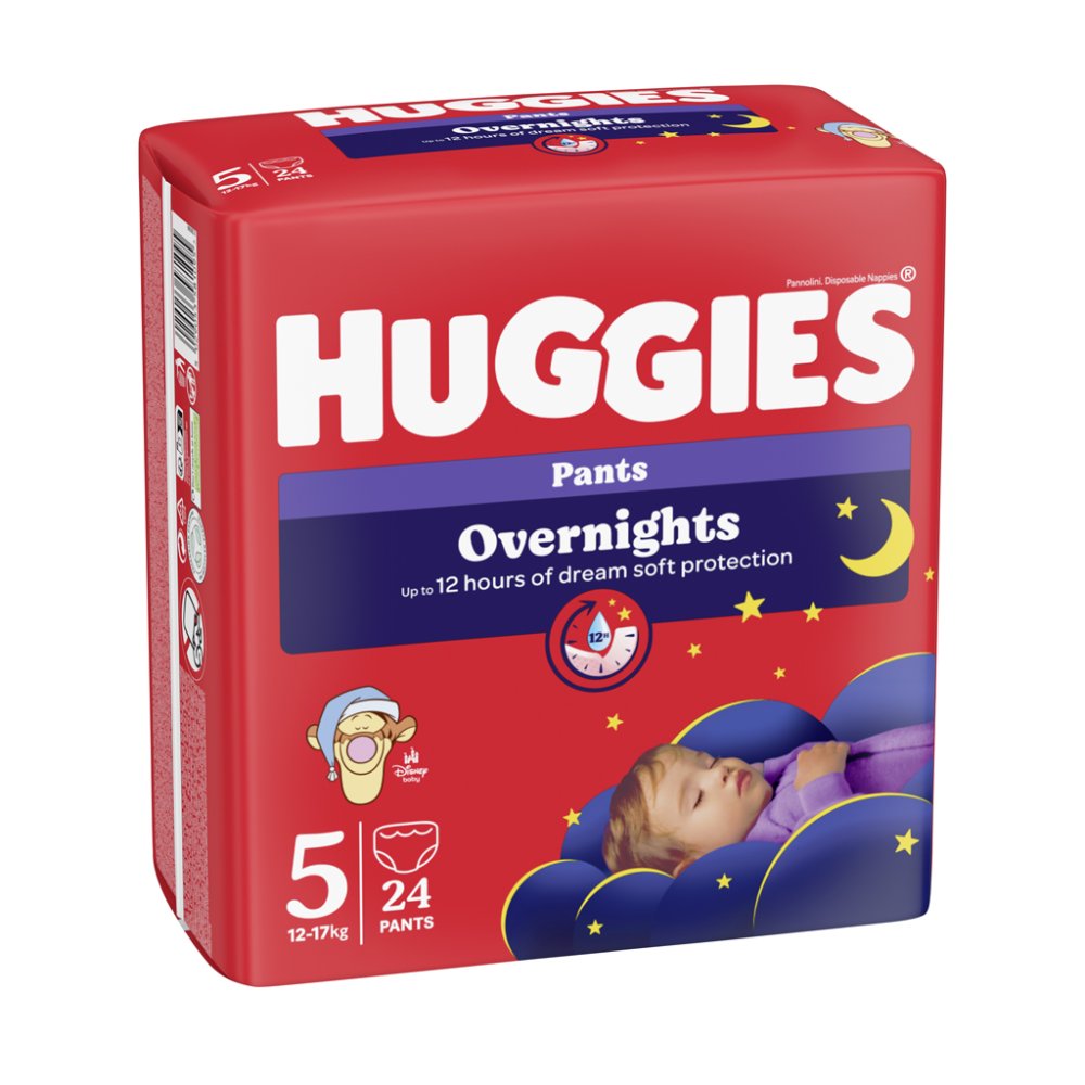 Les couches-culottes de nuit HUGGIES® Overnights offrent une protection fiable tout au long de la nuit, jusqu'à 12 heures. Douces et délicates pour un sommeil confortable. La technologie Quick Dry absorbe le liquide en quelques secondes.Double barrière anti-fuites pour une protection accrue. Les matériaux respirants permettent à l'air de circuler et de garder la peau de bébé au sec. L'indicateur d'humidité change de couleur lorsque la couche contient du liquide. Faciles à enfiler et à retirer.0% de parfum, de chlore élémentaire, de latex (caoutchouc naturel). Testé dermatologiquement. Taille 5, pour les enfants pesant entre 12 et 17 kg. Nombre de pièces dans l'emballage : 24.AVERTISSEMENT : Emballage en plastique – risque d'étouffement. Tenir l'emballage hors de portée des enfants.Adresse du fabricant : Kimberly-Clark B.V., Copernicuslaan 35, 6716 BM Ede, Pays-Bas / Marques déposées de Kimberly-Clark Worldwide, Inc. ou de ses filiales. © Marques déposées de KCWW (HUGGIES®, KLEENEX® LIDIE® KOTEX®) / www.kimberly-clark.com