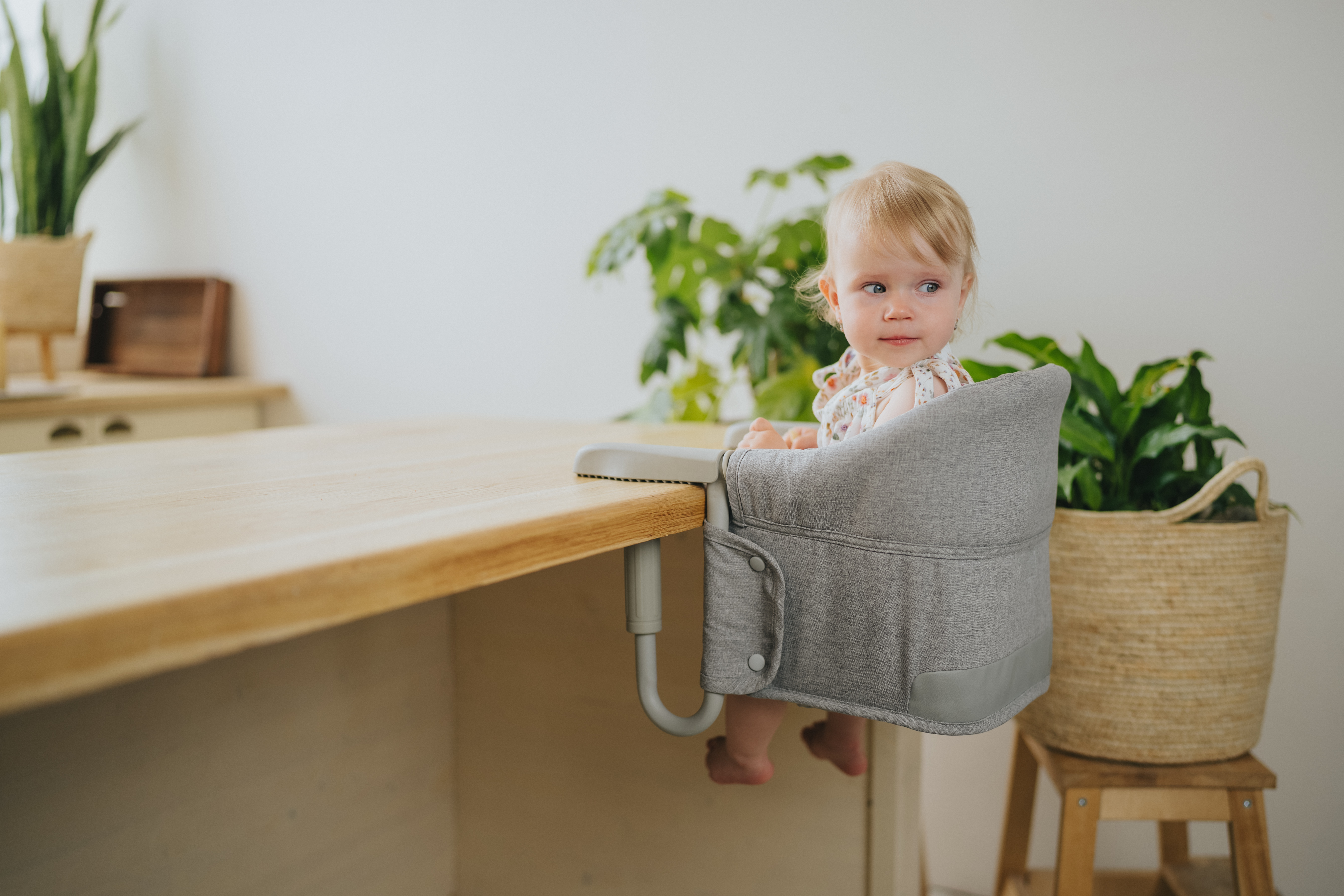 La chaise a la partie basse des flancs montants faits de coulisse en plastiques mous qui adhèrent complètement à la table, et la chaise donc ne bouge pas. C'est un produit très sûr pour les enfants jusqu'à 15,5 kg qui sont capables de s'asseoir tout seuls.
